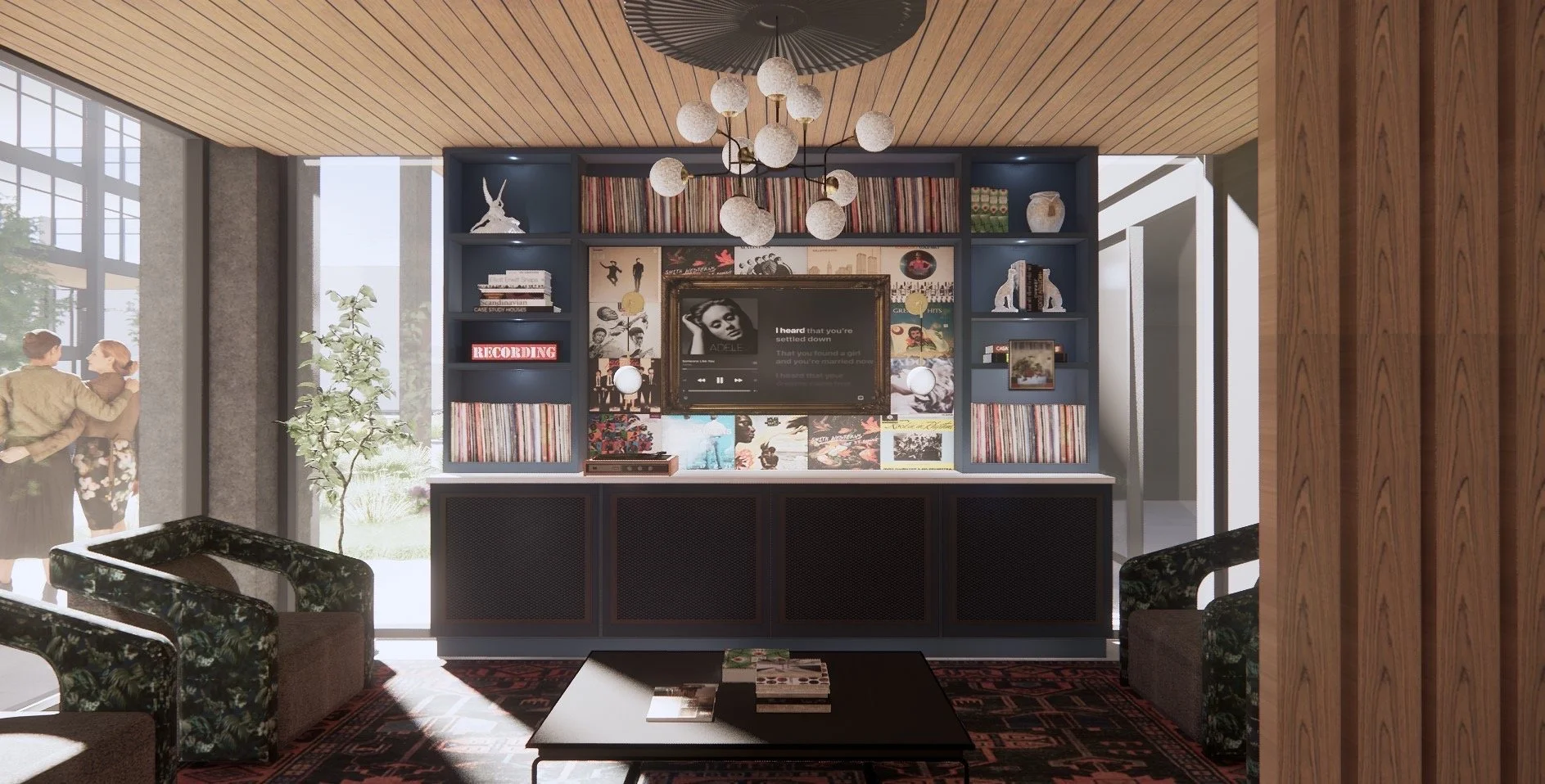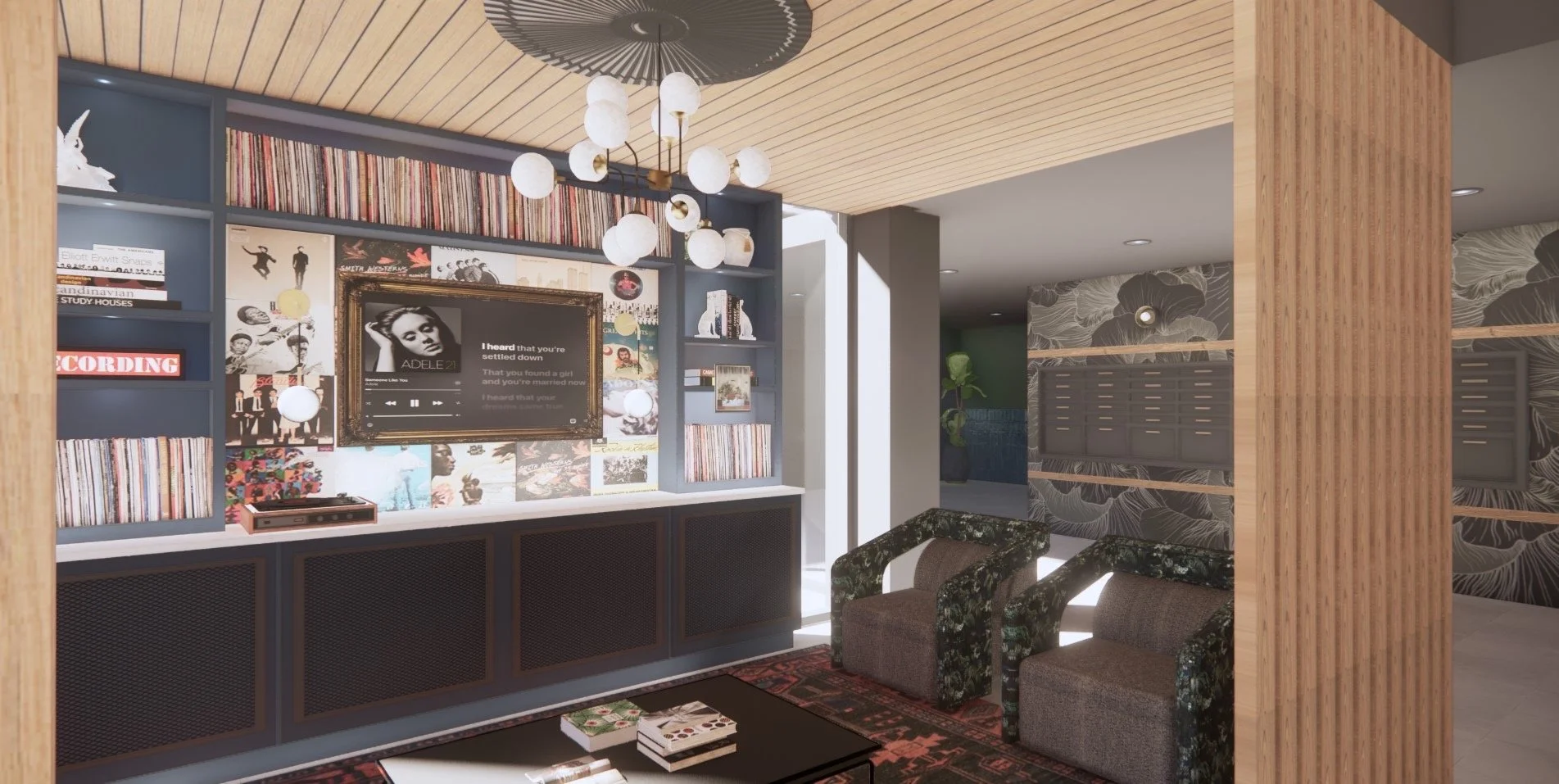 The goal of the design was to create a space where people can gather and listen to music, chat, and make memories. When you walk into the lobby there is a dedicated music room for people to gather and make memories.